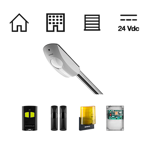 24 Vdc operator for intensive use with integrated control and encoder | Adjustable stroke by means of a mechanical stop in the case of rails with belt drive and two stops in the case of rails with chain drive | Anti-crushing system with power cut-off | Safe operation via batteries that can be perfectly integrated into the motor even in the event of a power failure | Advanced electronics with display and low-power auxiliary lighting | The encoder device offers maximum safety and precision in door movement | Quick coupling system of the connecting arm of the sliding shoe to the door