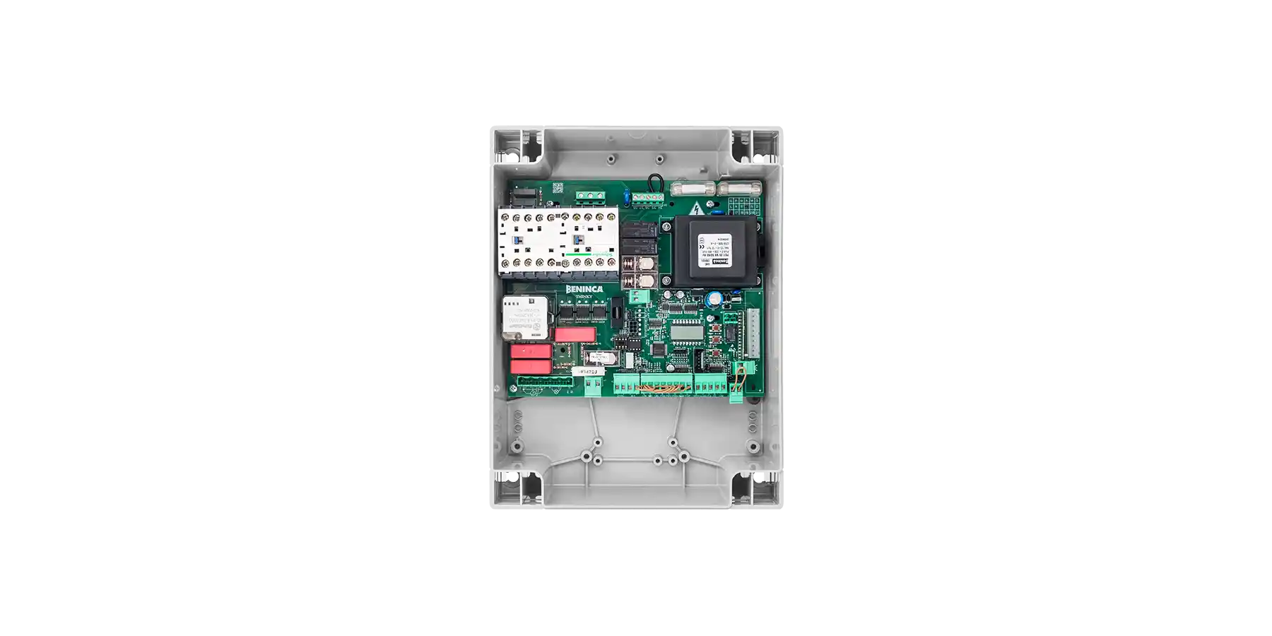 Integrated LCD display | Integrated 433.92 MHz radio receiver with 64 codes and ARC radio coding as well as preparation for radio receiver connection via plug connector | Preparation for connection of an absolute encoder and quick wiring (VN “ESW” motors) | Autoset function parameters for motors with absolute encoder (VN “ESW”) | Removable terminal strips | Automatic function logic, semi-automatic and with dead man function | Inputs for motor limit switches | Inputs for opening, closing, step operation, pedestrian door and stop | Inputs for 4 pairs of photocells (activation can be set for both opening and closing or only for closing) and PHOTO TEST logic | Input for N.C. or 8K2 safety contact strip | Input for safety sensor | Configurable output for “gate open” indicator light, second radio channel, auxiliary light and area light | Configurable output for “gate open” indicator light or photocell test | Output for flashing light connection | Phase failure and overcurrent protection | Management of parameters stored in the electronic control unit possible via Advantouch system | Number of movements | Access password for programming | Maintenance message