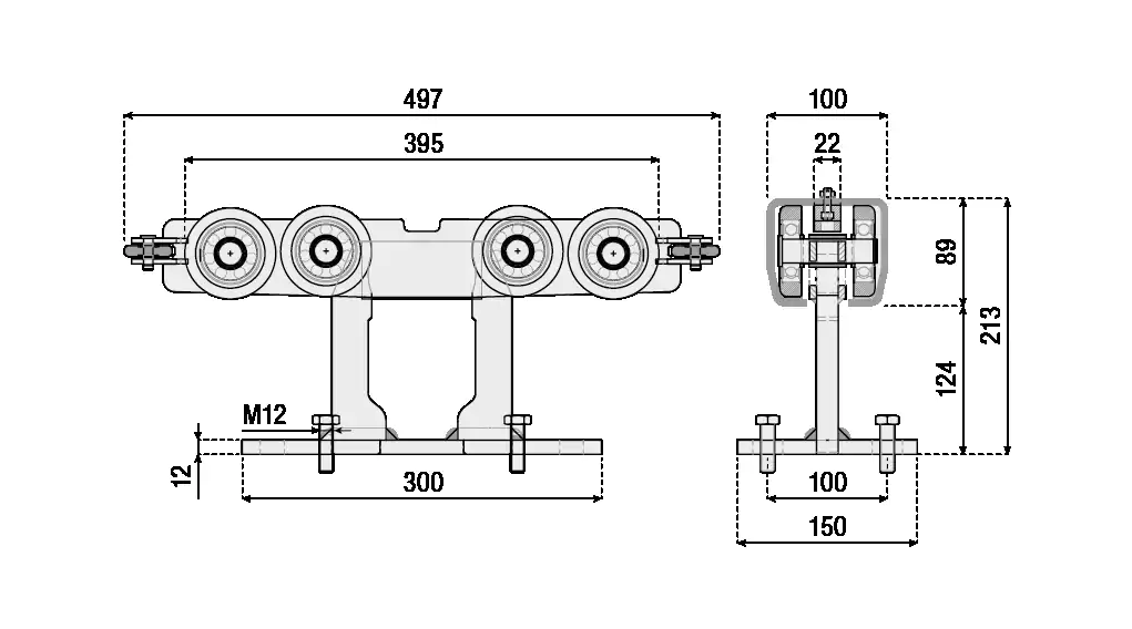 Tragender Wagen mit 8 Rollen ohne Ritzel, mit seitlichen Führungsrollen
